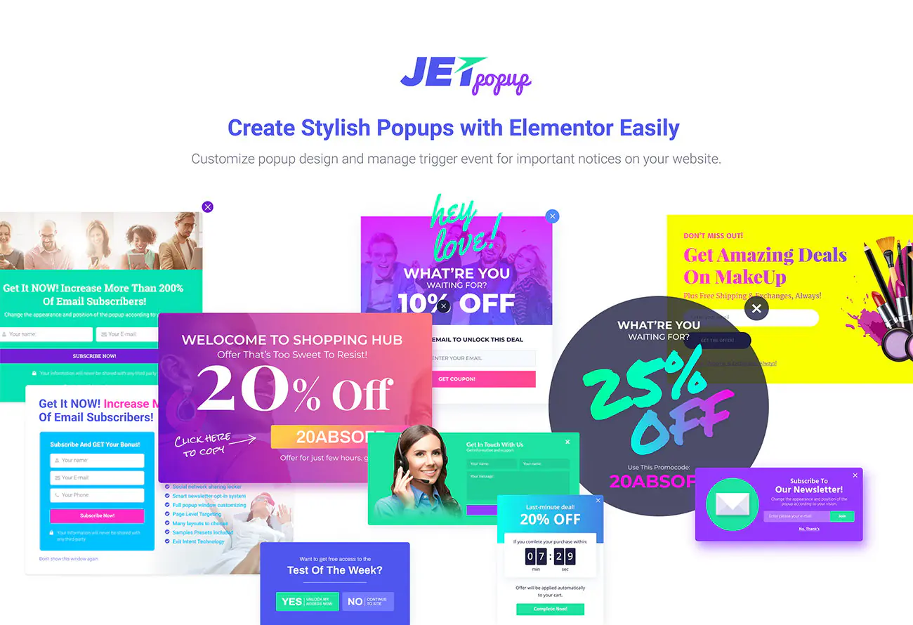 JetPopup is the plugin for Elementor allowing to create popup templates on different topics and set versatile entrance conditions for them, attach the templates to specific widgets, and display them on specific pages. With JetPoup one gets dozens of popup presets along with layout presets and huge functionality for changing the popup style and behavior.